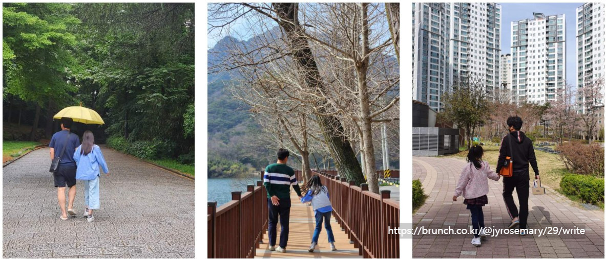 남편과 아이 둘 사이의 분위기는 모르겠으나 나란히 걷는 두 사람의 분위기는 영화 속 한 장면처럼 이쁘다.