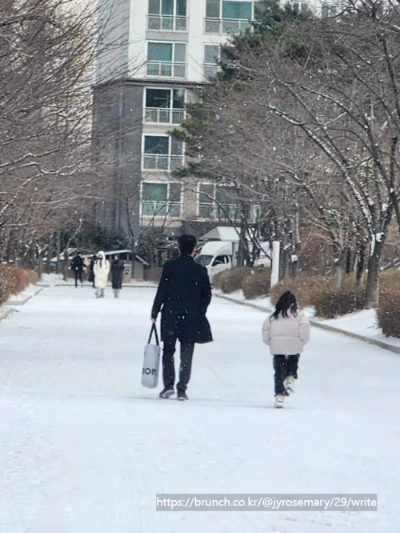남편이 아이에게 무언가 말을 하는 것 같은데 고개를 숙이고 걷는 아이는 듣고 있는 건가. 이내 아이는 살짝 몸을 돌려 걷는다.