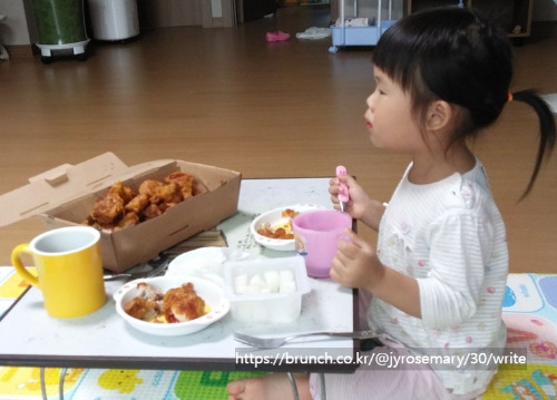 유치원이 끝나고 집에 돌아와 피곤한 하루 끝에 먹는 치킨의 맛을 알아버린 둘째다.