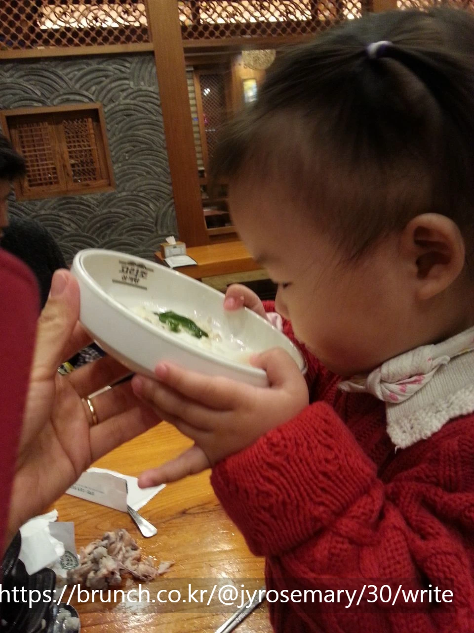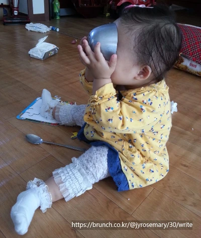 점심을 차리기 전, 배고프다는 둘째에게 우선 간단히 된장국에 밥을 말아 줬더니 어느새 숟가락은 내려놓고 밥 한 톨, 국물 한 방울까지 후루룩 남김없이 먹는데 밥이 입으로 가는지 코로 가는지 정말 알 수 없는 모습이다. 대체 밥그릇이 어디에 가 있는 것인지.