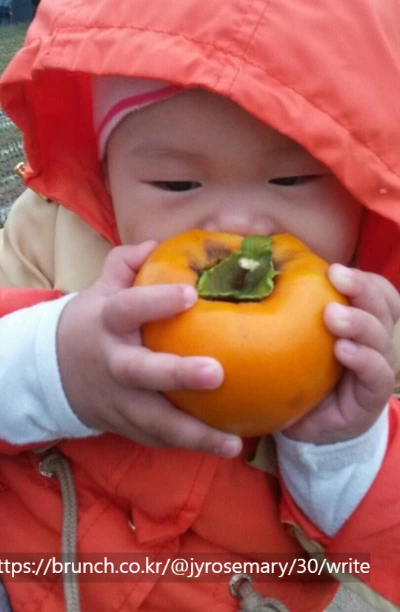 갑자기 둘째가 감을 덥석 베어무는 게 아닌가.
