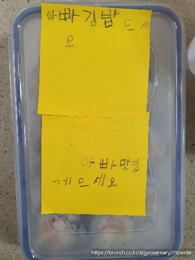 각자 정성스레 만든 김밥에서 몇 조각씩 나눠 아빠의 김밥 도시락을 만들고 이쁜 마음을 담아 메시지를 남겼다.