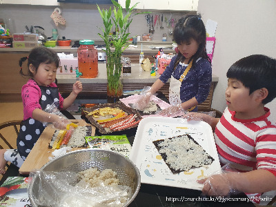늘 엄마가 준비해 준 김밥을 먹다가 먹고 싶은 재료로 처음 만들어보는 김밥이 재미있는지 다들 열심히 했다, 김 가득 밥을 담아서 김밥 옆구리가 터지지는 않을지 걱정이 되었다.