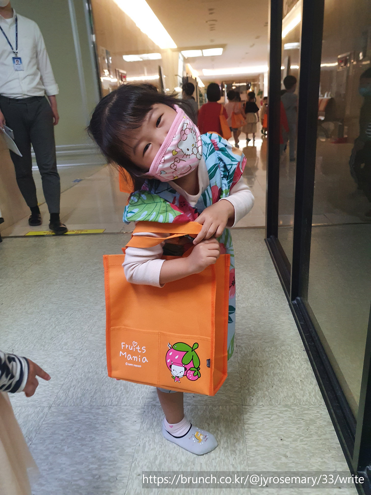 저 주황색 가방에 통장과 돈을 담고, 작은 덧신은 혹시나 아이들이 미끄러지지 않게 어린이집에서 나눠주었다. 아이의 작은 얼굴을 가리는 마스크가 이제는 낯설다.