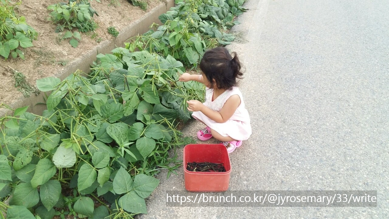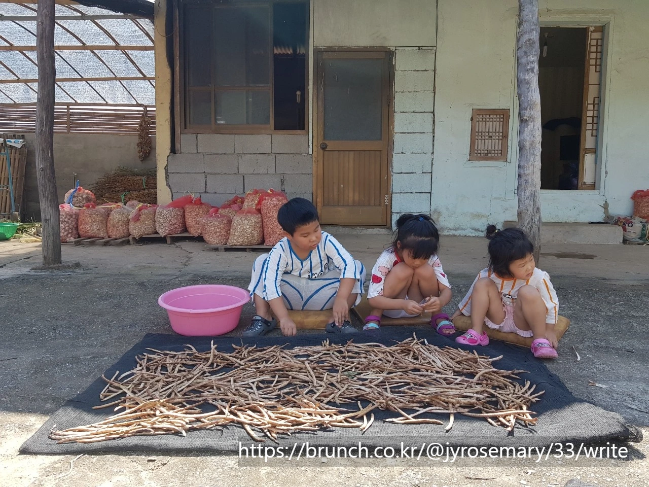 잠옷으로 갈아입고 할머니가 햇볕에 말려놓은 콩을 까는 아이들, 그 옆에서 이모가 이 콩을 다 까야 집에 갈 수 있다고 하니 셋째가 놀라서 이모를 바라봤다.