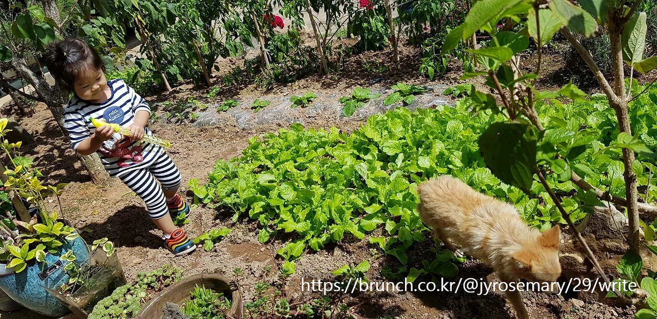 상추가 심어진 할머니 텃밭을 지나는 복돌이를 살금살금 따라가는 셋째의 표정이 무언가 생각이 있는 듯 수상하다. 손에 든 장난감에서 금방이라도 비눗방울이 강아지를 향해 뿜어져 나올 것 같다.