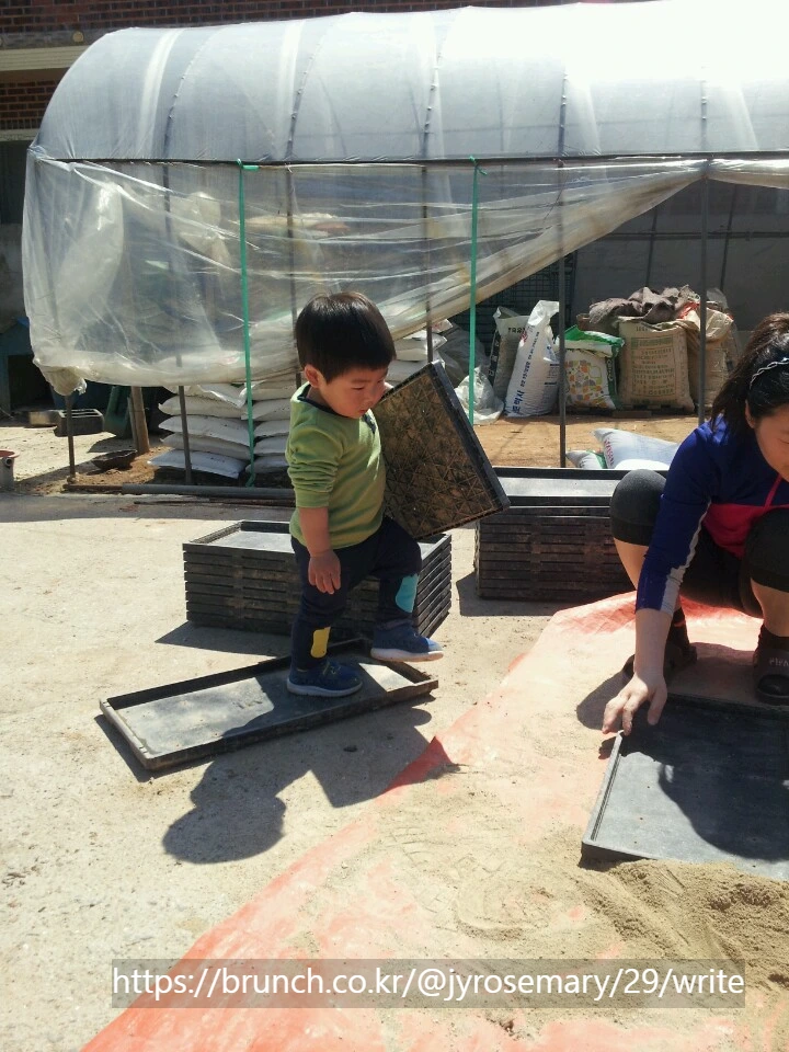 어느 해 봄날, 첫째 아이는 할아버지, 할머니를 따라 볍씨를 뿌릴 모판을 만드는 경험을 했다. 키만 한 모판을 드는 모습이 아슬아슬해 보이지만 아이는 여러 번 모판을 가져다 나르고, 작은 손으로 흙을 채웠다.