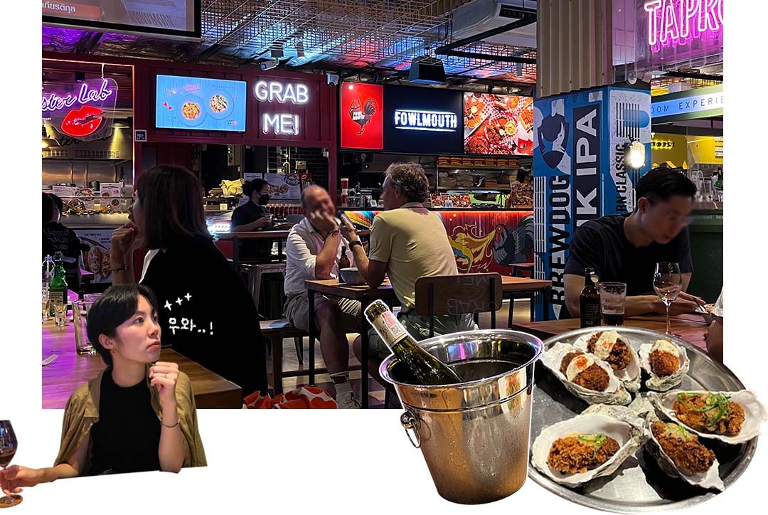 이곳은 the commons라는 복합 문화공간인데, 각자 원하는 매장의 음식을 사 와 라운지에 자유롭게 자리를 잡고 먹으면 되는 곳이다. 피자, 해산물, 똠양꿍, 아이스크림 식사이자 술안주로도 대체할 수 있는 가게들이 다양했고 사케, 와인보틀바, 크래프트 비어 등 술도 다양하게 고를 수 있다. (소주를 드시는 분도 계셨다.) 대단한 퀄리티는 아니었지만 푸드코트에서 굴튀김과 와인이라니 생각보다 그럴싸하지 않은가?