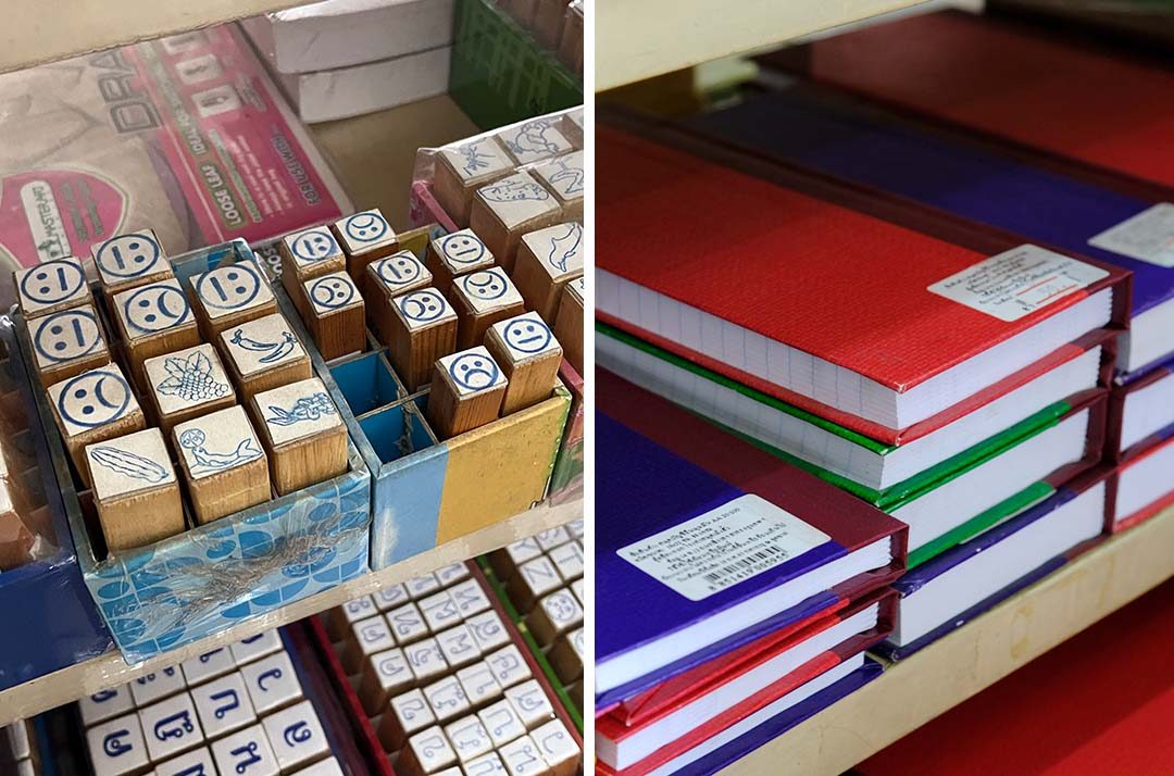 왠지 익숙한 이 느낌은 현경님의 태국문방구 책에서 봤던 곳이었다. 시간이 고스란히 쌓인 물건들로 퀄리티가 썩 좋진 않지만, 오래 전에 만들어진 감성과 손맛이 느껴지는 제품들은 구경하는는 재미가 쏠쏠하다. 쨍하고 산뜻한 컬러 조합의 장부 수첩은 우리의 장바구니 속으로 겟.