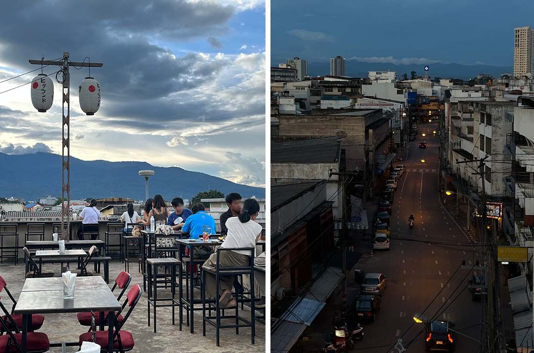 낮에 지나가다 발견한 옥상에 위치한 Hide Land라는 음식점이 있었다. 창모이로드를 구경하며 맥주 마시기 좋을 것 같아 치앙마이의 마지막 밤은 이곳으로 정했다. 어쩌다 보니 오픈런을 하게 되었는데, 탁월한 선택이었다. 예상한 것보다 더 멋진 조망을 가진 곳이었다. 왼쪽으로 고개를 돌리면 구름이 걸쳐진 높은 산등성이가, 오른쪽으로 돌리면 정겨운 창모이 로드가 한눈에 담기는 곳. 밝은 풍경부터 어둑해지는 시간을 그대로 느끼며 기분 좋게 취해갈 수 있는 곳이다. 시간이 조금 지나 어둑해지니 퇴근한 사람들이 모여 가게는 한껏 시끌벅적해졌다. 차곡차곡 쌓여가는 태국의 장면들을 되새김질하며 맥주는 한잔이 되고, 두 잔이 되고, 세잔이 되었다.