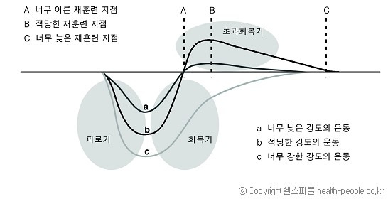 한번 운동으로 체력 소모가 가장 심한 c 상태가 되면, 다음날 몸살하거나 체력 감소로 매우 힘든 상태가 됩니다. 다음에 운동하려면 1/2로 줄여서 운동 해야 합니다.