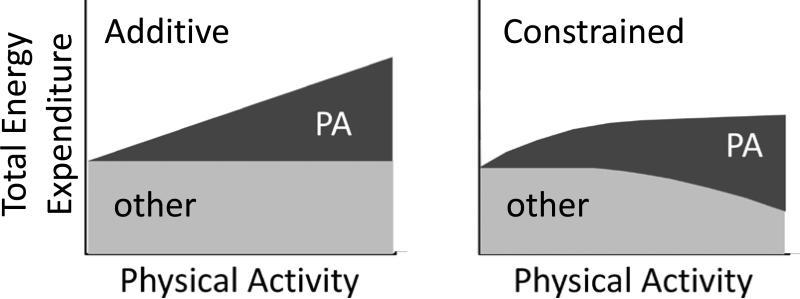 좌측의 그래프는 우리가 알고 있는 내용입니다. 그래프에서 회색에 'other'는 신체활동 제외하고 몸에서 사용하는 에너지입니다. 체온, 혈압 등 유지하는데 필요한 에너지입니다. 위쪽에 검은 부분 'PA'는 신체활동 즉, 운동에 의한 에너지 소모량입니다. 신체활동이 늘어나면 Y축으로 총 에너지 소모량이 증가한다는 그래프입니다.