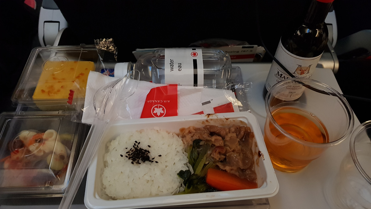 처음 타보는 에어캐나다... 키즈밀에 대한 평이 별로인데다 이미 성인 만큼 먹는 아이들이라 키즈밀 신청을 안했다. 후기를 보니 밥이 제육볶음, 불고기, 찜닭 등 한식이 너무 잘나오길래 한참 기대했었는데 아뿔사! 인천출발이 아닌 나리타출발이라... 일본음식이 나오는 걸 깜빡했다. 다행히 규동 느낌의 소고기와 밥이 있어서 맛있게 먹었다.