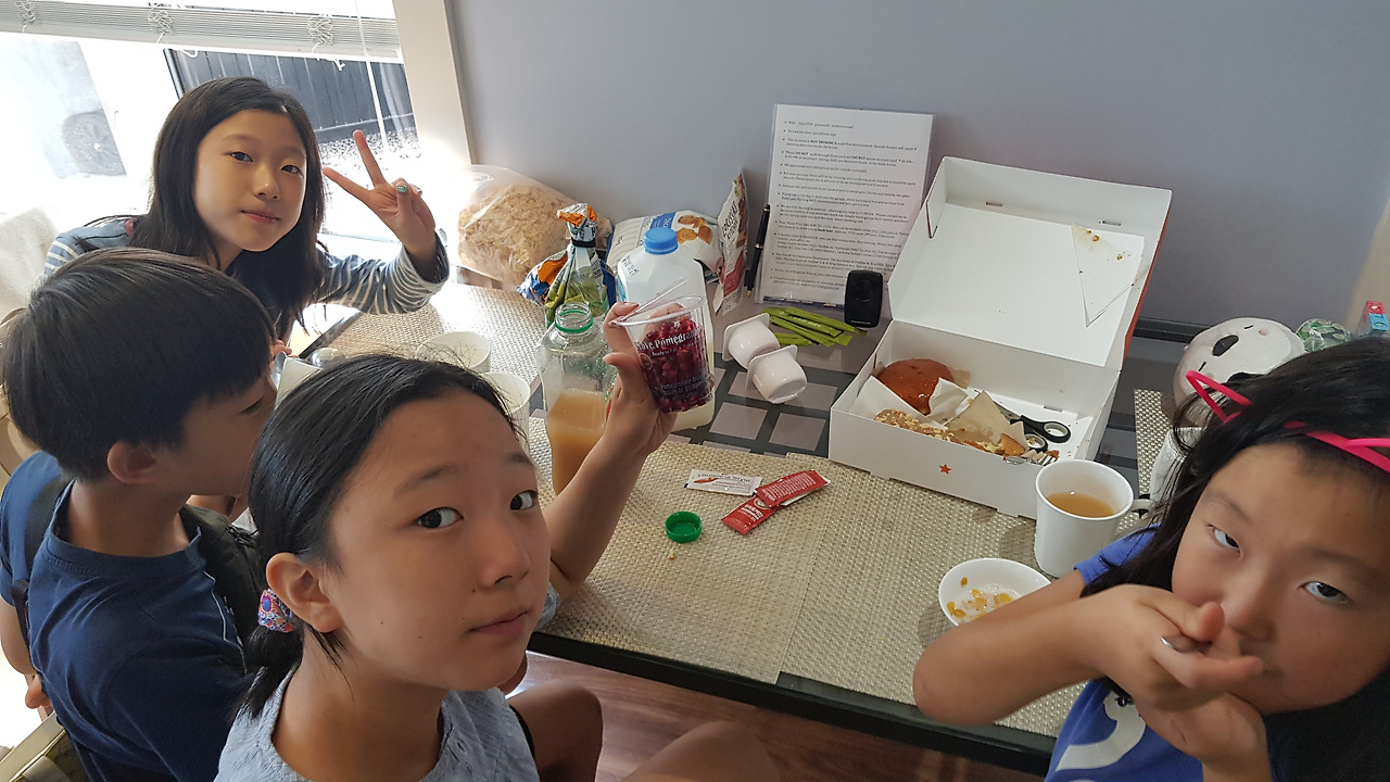 시간은 이미 9시였다. 여행 6일 차에 머리끈 봉지를 꺼낸 막내. 늘 머리 묶어줄 겨를이 없어서 산발로 보낸 게 미안했기에 늦더라도 빗질하며 열심히 묶어주었다. 어제 교실 찾느라 헤매서 그런지 머리 묶자마자 언니 오빠를 제치고 먼저 학교로 가버렸다(숙소에서 주니어 스쿨까지는 불과 50미터). 남은 큰 아이들을 준비물 챙겨서 다녀오라고 인사하고 돌아서는데 차를 태워달라며 다시 들어온다. 결국 세수도 안 한 잠옷 차림으로 신발 끌며 차를 세워둔 도로로 나와 시니어스쿨까지 내려주고 다시 숙소에 왔다.