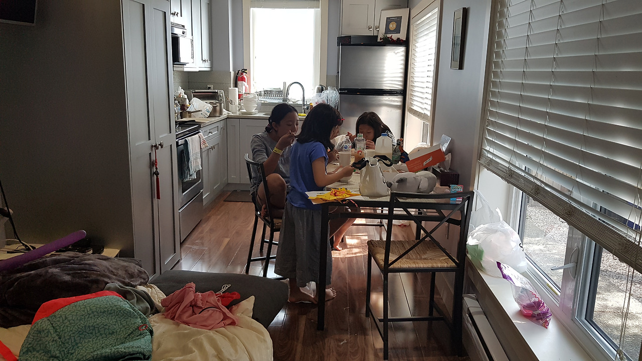 7시 알람을 보내고 뒤척이다 8시 알람에서야 겨우 몸을 일으켰다. 이름만큼 cozy 한 숙소이지만 베개가 창문 바로 밑이라 새벽부터 온 얼굴로 햇살을 견디고 있었다. 주섬주섬 1층으로 내려오면서 아이들을 깨웠으나 요지부동... 어제 먹고 남은 냄비 속 날아가는 쌀로 도시락을 싸야 하는데 앞이 캄캄하다. 퍼석하게 굳은 아이를 어떻게 해야 하나... 일단 코스트코에서 사 온 만두를 프라이팬에 구우면서 수프를 끓이기 시작했다.