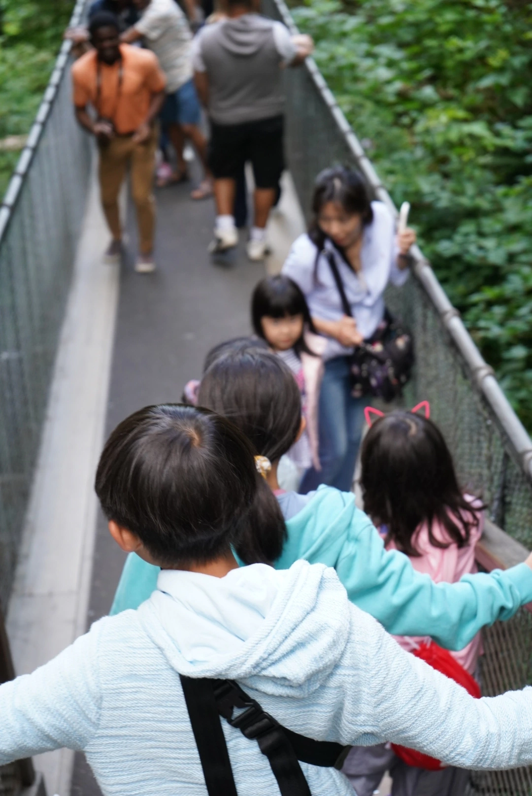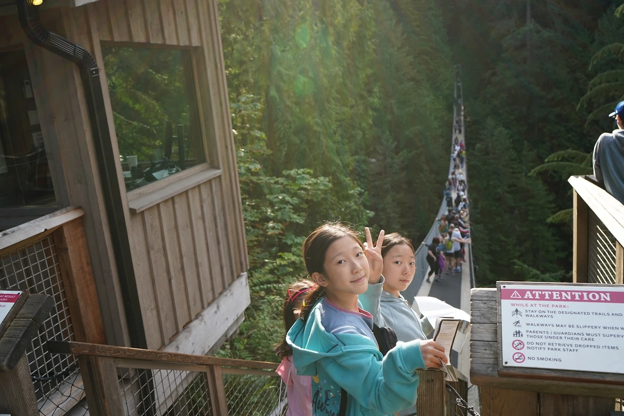 사진 좀 찍고 둘러보다 보니 어느덧 다시 서스펜션 브리지 입구에 다다랐다. 다리가 생각보다 심하게 좌우로 흔들리길래 또 심호흡을 하며 들어서는데... 맞은편에서 넘어오는 초면의 누군가라도 붙잡고 갈만하냐고 묻고 싶었지만 왠지 담담해 보이는 그들의 얼굴에 살짝 무안할 것 같아 다시 용기를 내고 걸어갔다. SF 영화를 많이 본 탓일까... 온갖 이런저런 상상을 더하다 보니 어느덧 다리 중반에 다다랐다. 아이들이 걸어오는 모습을 찍어주려고 일부러 안 움직이고 있었는데 끝까지 간 아이들이 다시 돌아오지를 않느다. 손을 저으며 오라는 표시를 해도 요지부동.. 결국 그렇게 대치하다가 아이들이 다시 건너왔다. 어드벤처 코스가 건너편에 있어 다리를 건너야 한다는 요지. 결국 남은 다리를 건너서 트리탑까지 마치고 다시 왔던 다리를 건너오는데... 너무 수월한 거다. 아예 다리를 좌우로 힘차게 흔들며 오는 여유까지 생겼다. 역시 경험이란 위대하구나... 상상을 내려놓으니 이렇게 수월한 것을...