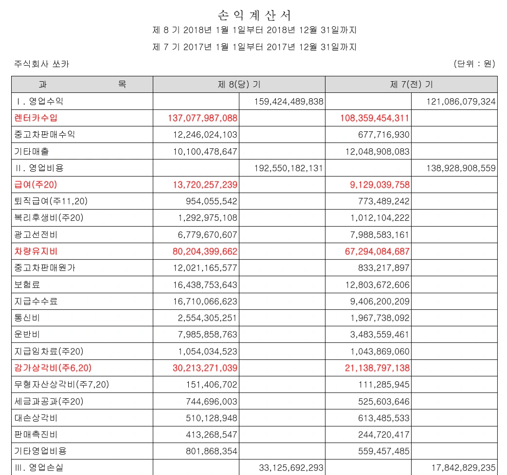 쏘카의 과거 실적을 확인하기 위해 우선 지난 2017~2018년의 손익계산서를 한번 살펴보겠습니다.