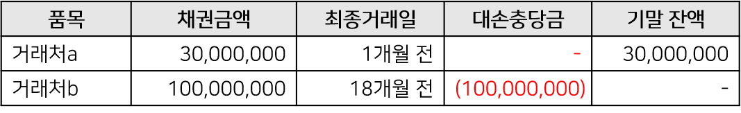 위와 같이 거래처별로 채권이 집계되면, 거래처별 최종 거래일이 언제인지 파악이 됩니다. 그게 왜 중요하냐 하면.. 최종 거래일 후 오랫동안 회수되지 못한 채권은 결국 돌려받지 못하는 경우가 많습니다. 일반적으로 최종 거래일 이후 1년이 경과하였는데 그동안 그 거래처와 아무런 거래가 없었다면, 거의 대부분 돌려받지 못할 것이라고 가정합니다. 그렇게 되면 관련 채권금액은 0원으로 만들고 손실(대손상각비)을 인식하게 되는데요. 이런 회계처리를 누락하는 기업이 많습니다.