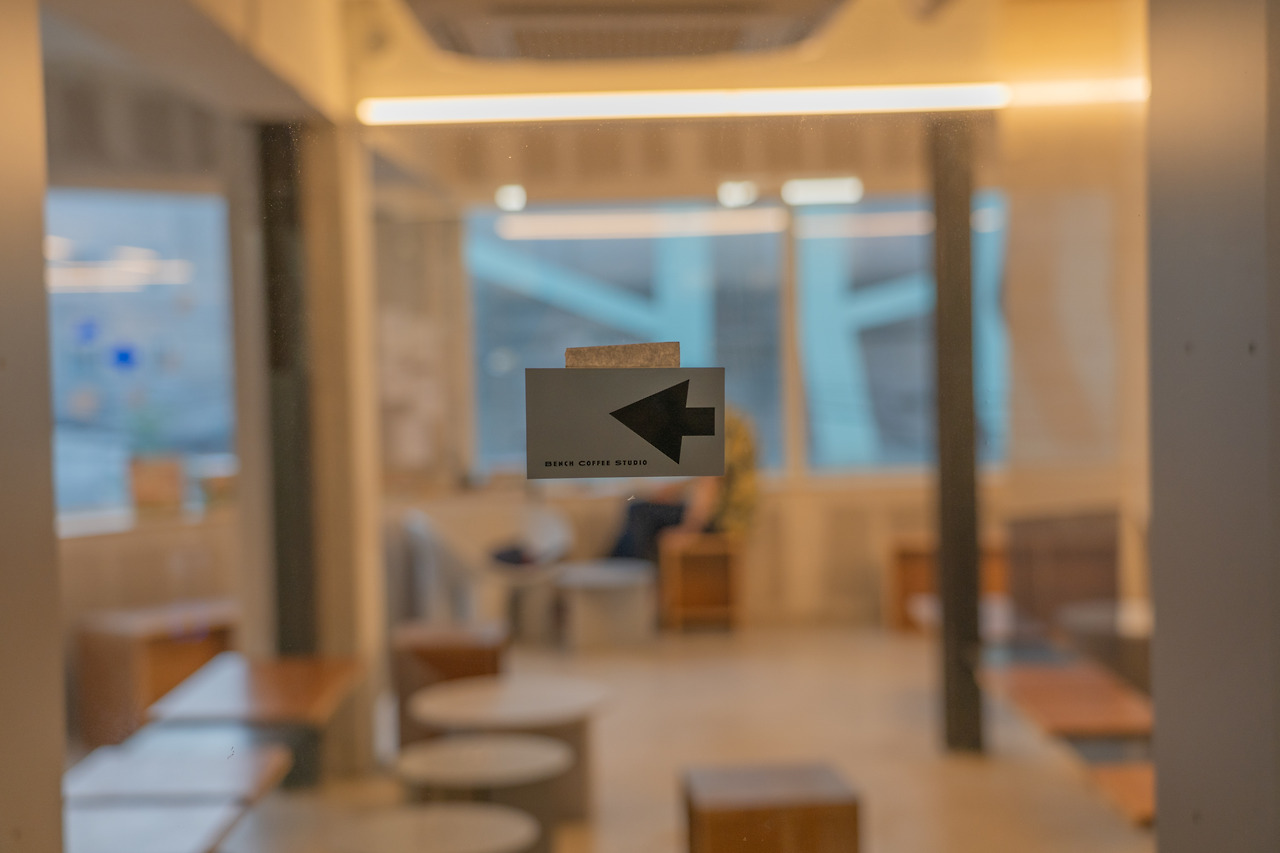 처음 돌아다닐 때는 찾기 힘들 것이다. 외부 간판이 없다 보니 이름을 보고 찾아갈 수도 없다. 사실 간판이 없는 것은 아니다 화살표 모양의 로고가 있고 그 옆에 COFFEE라고 크게 쓰여있으니까. 하지만 이것만을 보고 벤치 커피 스튜디오가 맞는지 확신할 수는 없으니 미리 주소를 알아서 오는 게 편할 것이다. 아무 표시도 없는 입구로 들어가 2층으로 올라가면 문 옆에 조그맣게 벤치 커피 스튜디오의 이름이 쓰여있다. 이름을 잘 지었다고 할까. 들어가는 순간 벤치, 커피, 그리고 스튜디오 3개 단어가 눈과 코로 바로 느껴진다. 막힘이 없이 시원한 스튜디오 공간에 사람들이 앉을 수 있는 벤치와 테이블이 쭉 놓여 있다.