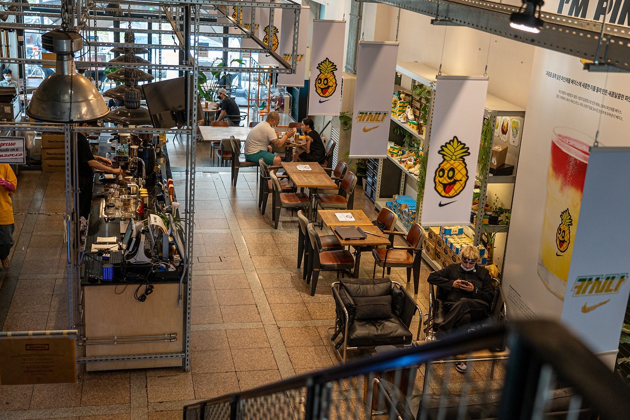 코아바의 공식 디스트리뷰터인 카시나 아카디움의 문에는 “Portland meets Seoul(포틀랜드, 서울을 만나다)”이라는 문구가 적혀있다. 카페에 들어서면 단순히 코아바 커피를 사용하기 때문만은 아니라는 걸 알 수 있다. 마치 포틀랜드 교외의 카페에 온 듯한 공간이 눈앞에 펼쳐진다. 날 것의 느낌을 그대로 살린 철근 인테리어는 물론 시원하게 뚫린 노출형 천장으로 거의 2개 층높이에 달하는 층고 덕분에 한층 넓어 보인다. 주문을 받는 바리스타들의 분위기도 여느 카페보다 캐주얼하고 자리에 앉은 손님들도 어딘가 포틀랜드에 온 듯 여러모로 자유로운 복장과 모습을 하고 있다.