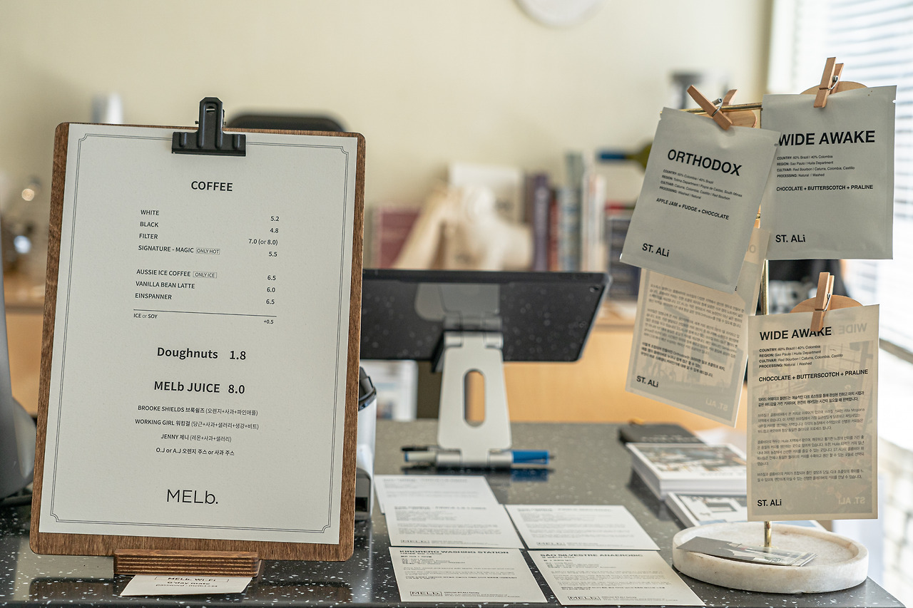 입구 위에는 MELb espresso bar라는 이름이 적혀있지만 외벽에는 ST ALi FAMILY의 간판이 달려있다. 멜버른의 유명 로스터리인 세인트 알리(ST ALi)의 공식 수입원임을 알 수 있는 표시이다.