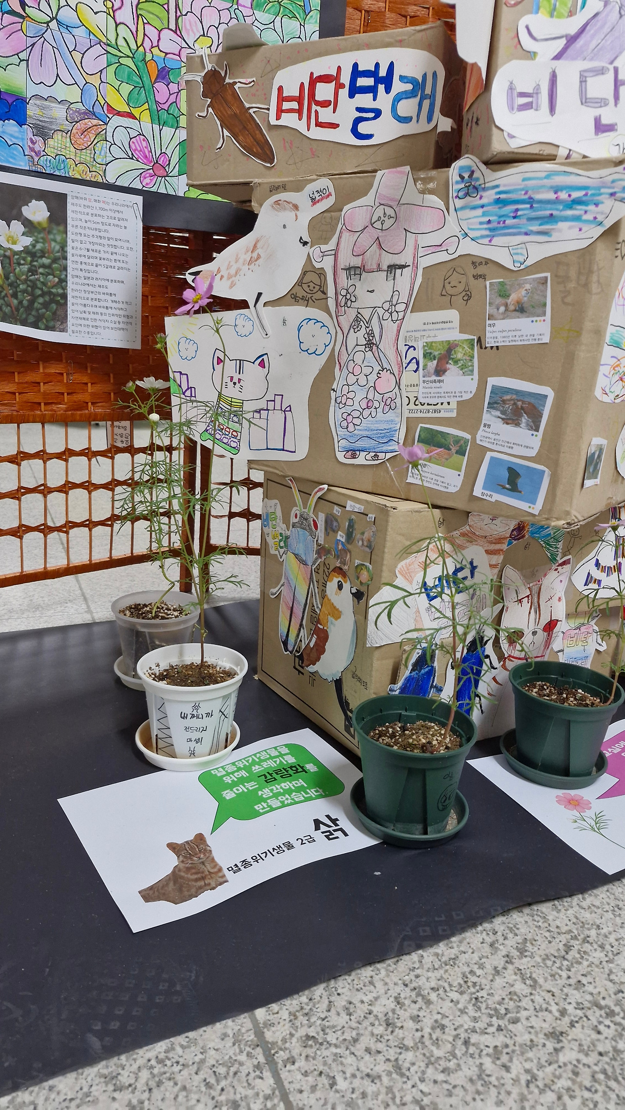 다행히 꽃이 상하는 일을 없었고 반 작품과 어우러져 긍정적인 반응까지 얻었다. 모쪼록 작품을 철거하고 교실로 가져올 때까지 별일이 없으면 좋겠다.