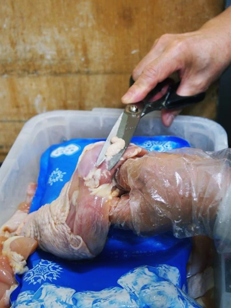"이건 순살(용 생닭)이야. 요게 다리 하나야. 이거 봐. 여기 기름 있지? 본사에서 올 적에 이거 푹덕푹덕 짤라서 그냥 오거든? 이거를 내가 다 잘라내."