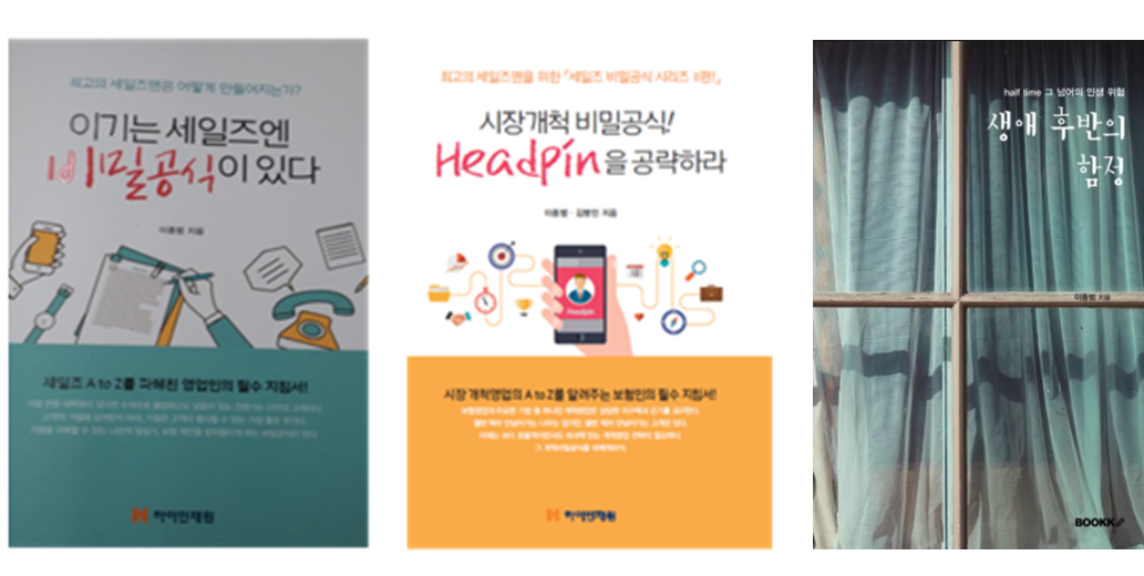 이 또한 누구나 꿈꾸어 보는 버킷리스트 중 하나 일 수 있습니다. 지나고 보니 3권의 책을 완성할 수 있었습니다. 2015년 “이기는 세일즈엔 비밀 공식이 있다”, 2016년 “시장개척 비밀 공식, 헤드핀을 공략하라!” 2017년 “생애 후반의 함정”이 그것입니다