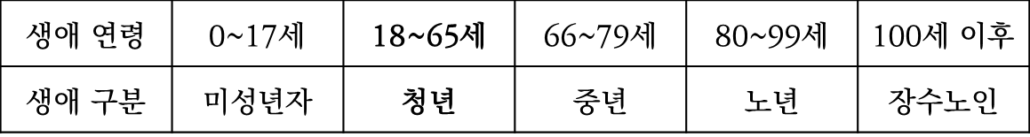 2015년 UN이 생애 주기를 5단계로 나눈 것이 그것인데 특히 대한민국의 중년기에 해당하는 40세~60세 구간이 주목을 끌었다.