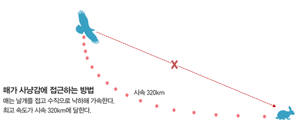 2. 사냥감과 어느 정도 가까워지면 순간적으로 날개를 접어 목표를 향해 내리꽂는다(자유낙하 최고속도 320km)