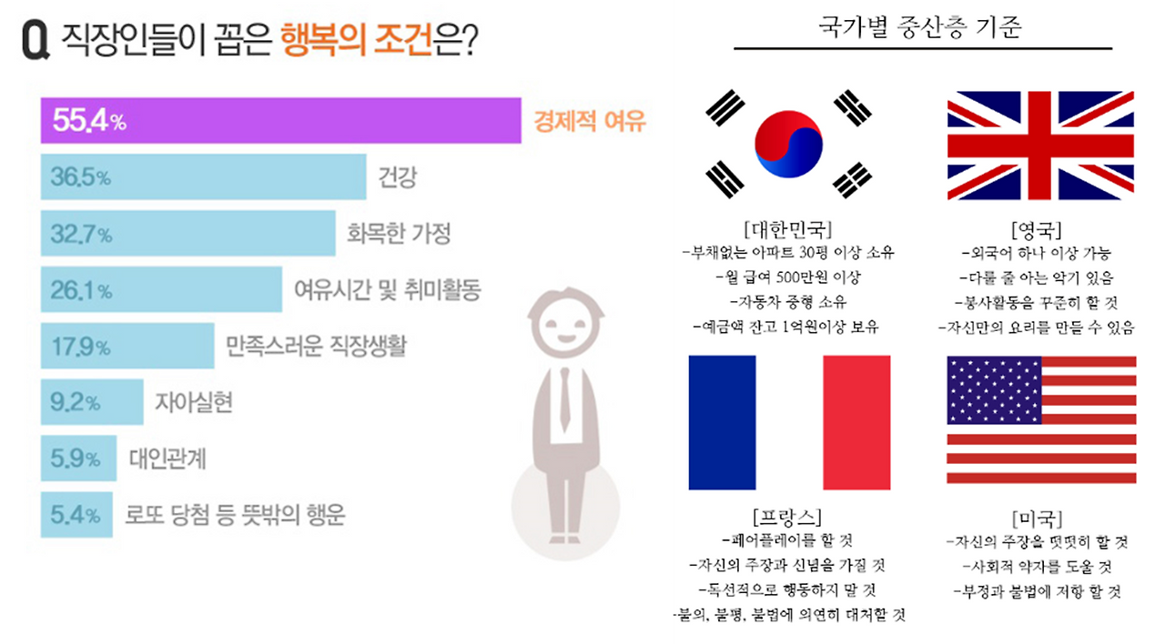 이와 같은 질문에 대한 답은 차이가 있다. 하지만 한국에서는 보다 많은 사람들이 돈은 행복을 결정하는데 중요하다는 것에 동조하는 경향이 크다. 뿐만 아니라 비교적 안정적인 가정을 뜻하는 중산층에 대한 인식도 다른 나라와 관점의 차이가 분명하게 드러난다. 특히 돈(재산))을 대하는 쏠림의 정도가 남다른 것을 알 수 있다