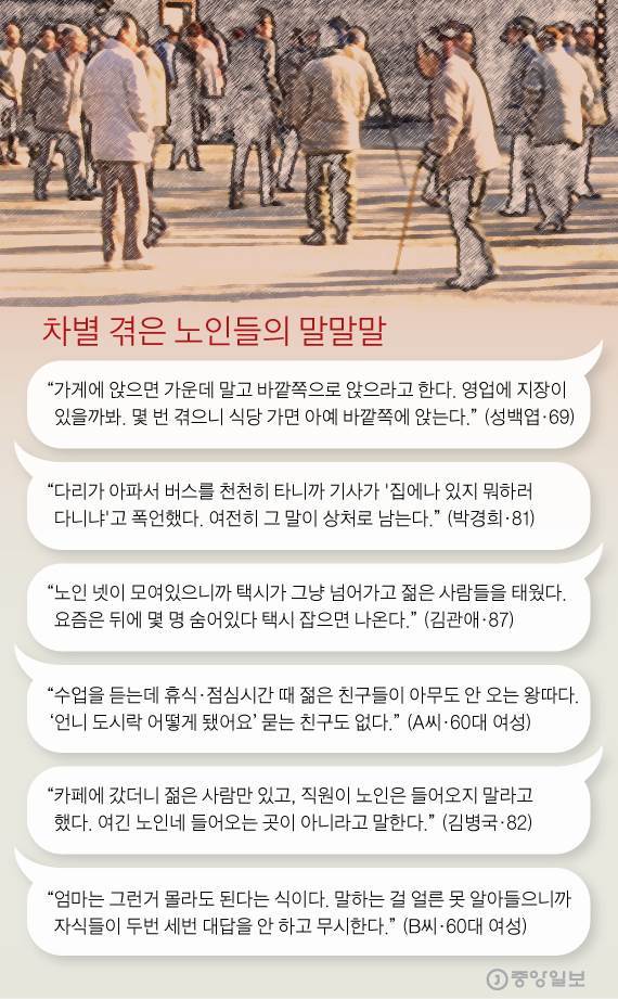 “노인 오면 장사 안 된다”, “뭐 하러 나다니냐” 노인차별 사회에 관한 기사였다. 평소 노년에 관한 관심이 많다 보니 그냥 흘려지질 않았다.