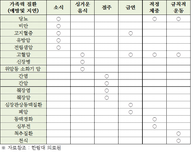 각각의 생활 습관은 가족력 질환을 피하는데 유용한 습관으로 명시하였습니다