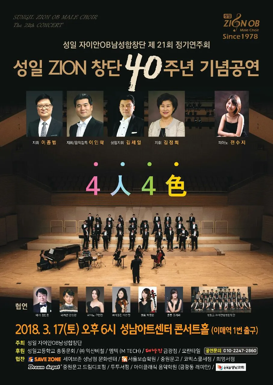 생각해 보면 쉽지 않은 기간을 이어왔다. 빡빡머리로 만났던 ZION 합창단 동문들의 얼굴에서, 머리에서 지나간 세월의 흔적을 발견하는 것은 너무도 쉬웠다. ZION 동문 들 중엔 성악가와 목회자들이 다수 배출되었다. 특이한 것은 지나온 40년 동안 성일 고등학교 ZION 합창단 출신만으로 팀을 구성하였다는 사실이다. 언제까지 이와 같은 전통이 계속될 수 있을지 모르지만 지나온 40년의 저력으로, 향후 40년을 더 이어갈 수 있다면 인간의 일생이라고 평하는 창단 80년 연주회도 가능할 것이다.