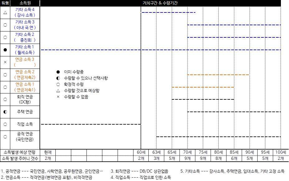 2. 60세 이후 고정 소득이 발생(또는 예측되는) 연령을 기재하고 그때부터 소득이 끝나는 나이까지 선을 그어 표시합니다