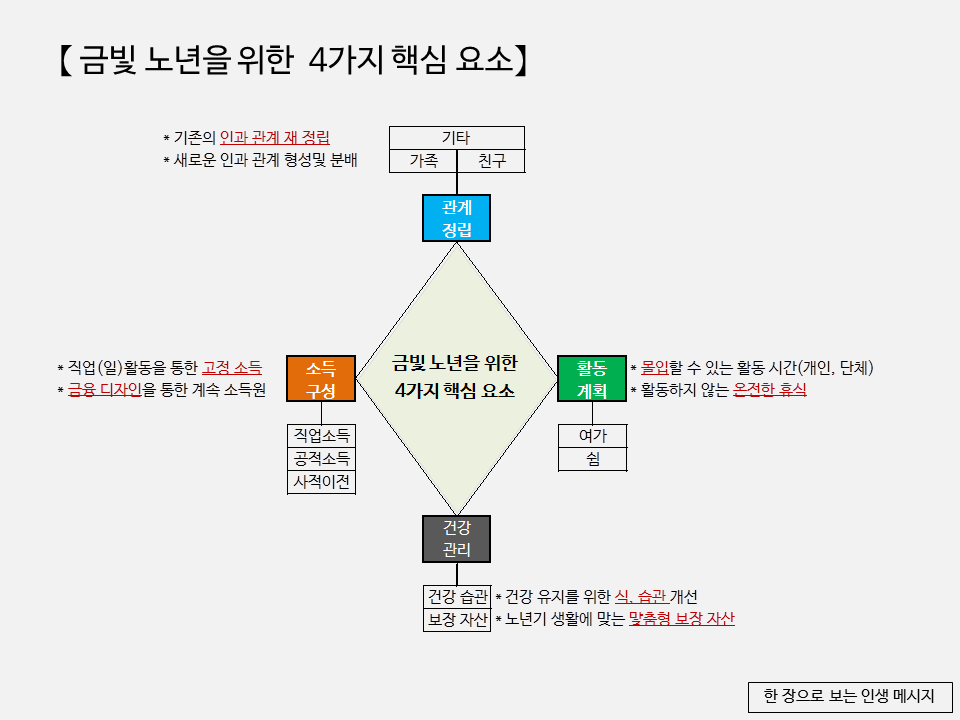 건강은 정말 중요한 요소지만, 평소엔 푸대접하기 일쑤다. 평소의 건강 관리가 노년기 인생의 질을 결정하는 핵심 요소임을 잊지 말자.