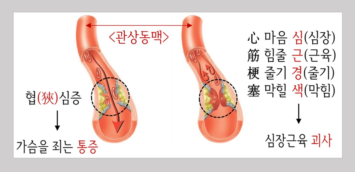 협심증(狹心症)은, 심장으로 혈액을 공급하는 관상동맥이 동맥경화로 인해 좁아지면서(狹 좁을 협) 극심한 통증을 유발하는 질병입니다. 반면에 심근경색은 관상동맥이 막히면서 혈액이 공급되지 않기 때문에, 심장근육이 손상(썩는)되는 상태를 말하죠. 심장질환은 극심한 흉통을 수반할 뿐 아니라 심장기능 저하, 부정맥 등의 합병증이 발생하고, 호흡곤란과 쇼크 등, 생과 사를 오가는 골든 타임의 중요성을 깨닫게 하는 대표적 질병이기도 합니다.