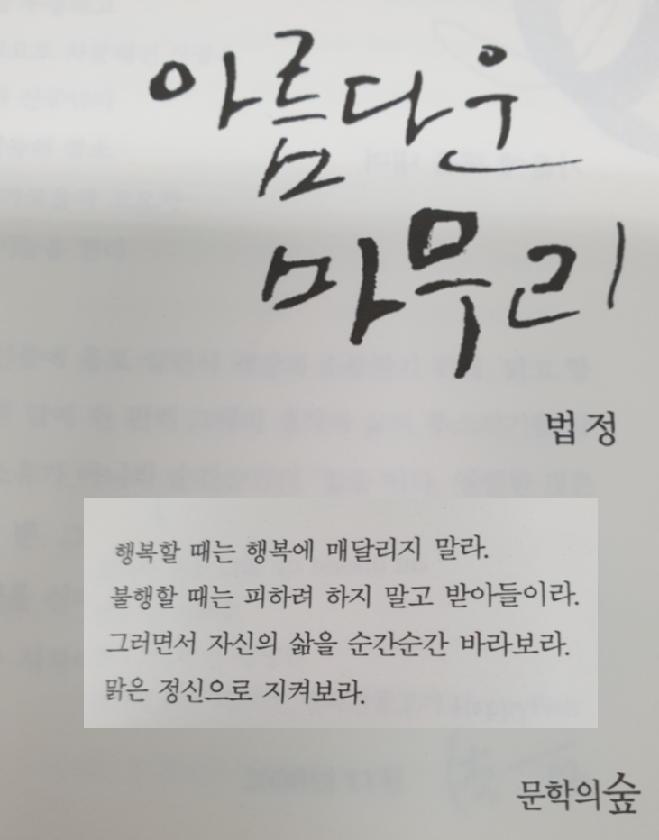 잠실역으로 발걸음을 재촉했다. 8호선 전철역 지하 통로에 있는 알라딘에 가야 했기 때문이다. 마치 오랜 친구를 만나러 가는 기분처럼 약간의 설렘이 있다. 그 이유는 법정스님의 <아름다운 마무리> 때문이다. 퇴직이 얼마 남지 않아서 그런지 잘 헤어져야 한다는 생각이 많아진다. 책 제목도 예사롭지 않다. 더군다나 지은이가 법정 스님이라 더 끌리는지도 모른다. 이 책은 내 속에 묻힌 어떤 생각을 자극하게 될지 사뭇 궁금하다. 무엇보다 그분의 통찰을 접할 수 있다는 게 감사하다.
