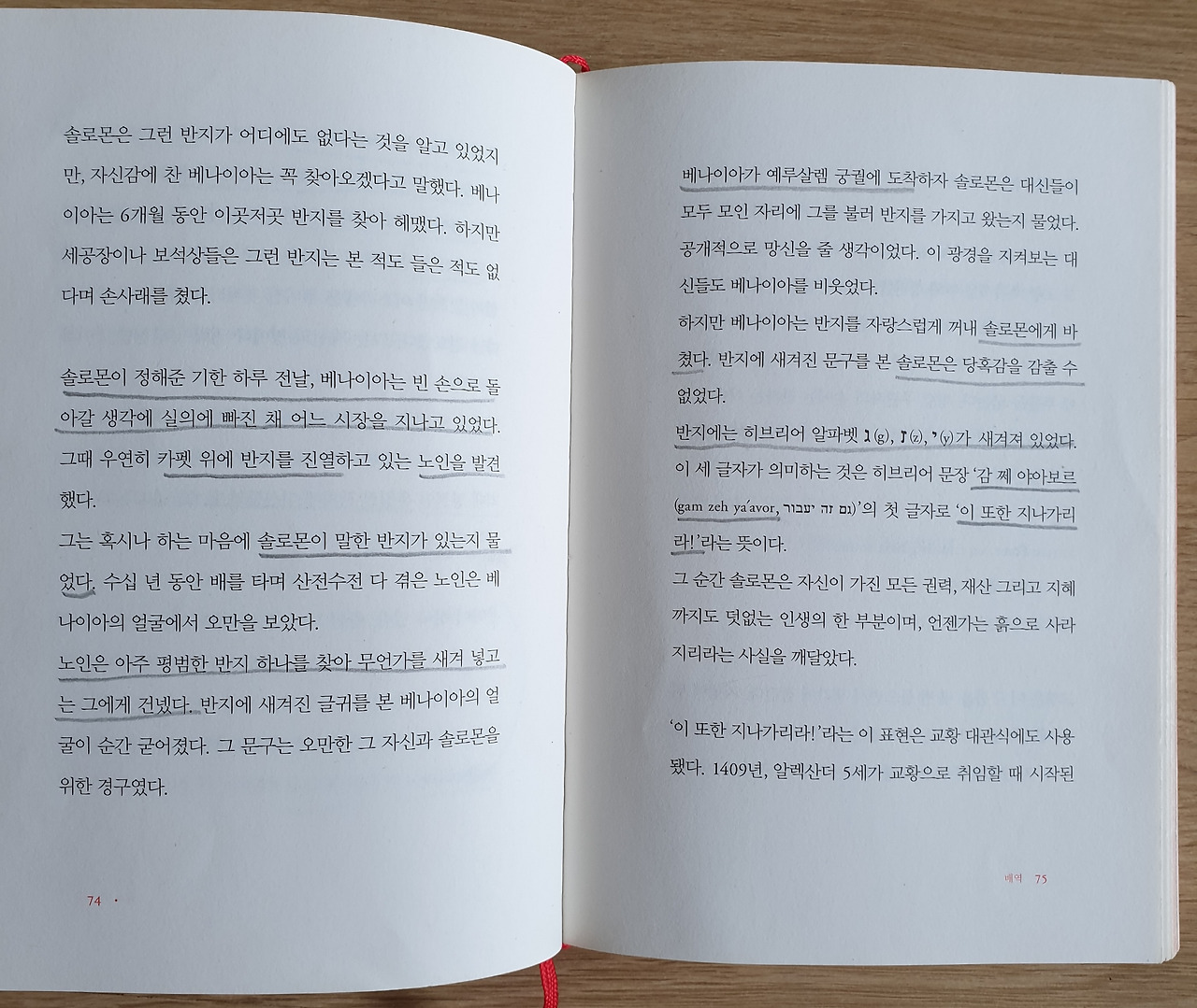다음날 예루살렘 궁전. 공개적으로 망신을 주려는 솔로몬 왕은 대신들이 보는 앞에서 베 나이아에게 반지를 가져왔는지 물었고. 이광경을 지켜본 대신들도 베나이아를 비웃었다. 그런 상황에서 베나이아는 노인이 준 반지를 솔로몬에게 바친다. 반지를 건네받은 솔로몬 왕은 베나이아와 마찬가지로 반지의 문구를 보면서 당혹감을 감추지 못한다. 그 이유는 히브리어 '감 째 야아보르(gam zeh ya'avor)_이 또한 지나가리라'를 뜻하는 글자가 새겨져 있었기 때문이다. 순간 지혜의 왕 솔로몬은 자신이 가진 모든 것들이 언젠가는 흙으로 사라진다는 사실을 깨닫게 된다.