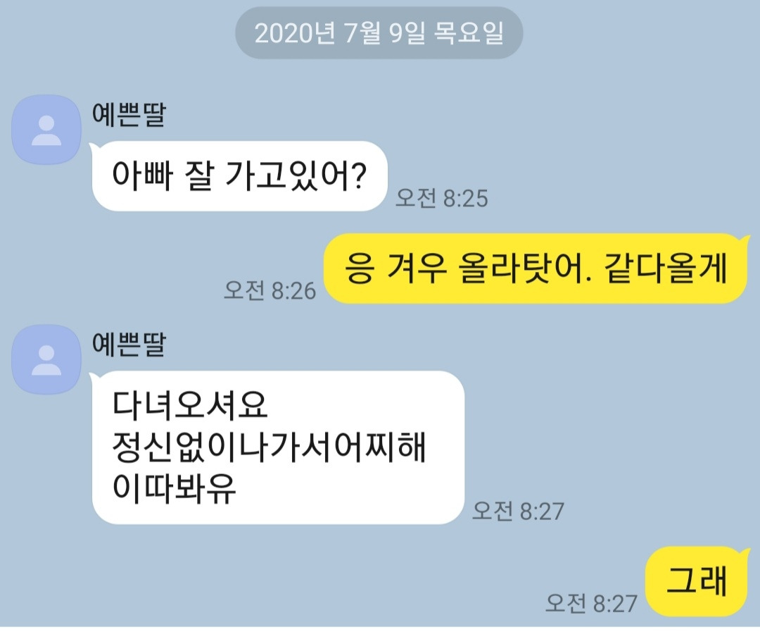 딸아이가 정신없이 뛰어나간 아침 상황이 걱정되는지카톡을 보냈다