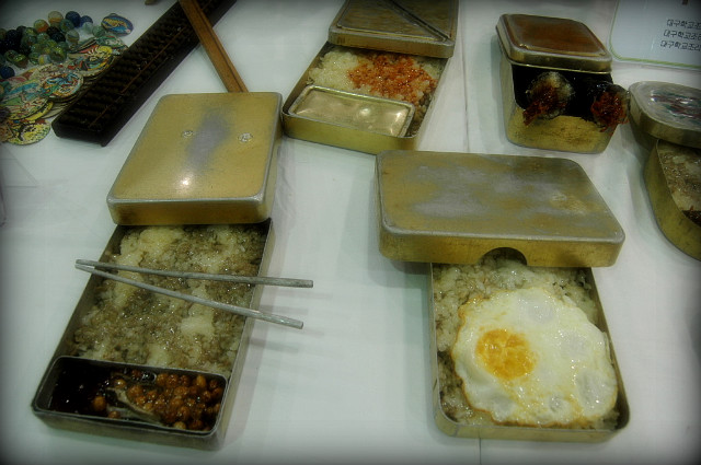 기억 속에 존재하는 도시락은 네모난 양은 도시락이다. 뚜껑을 열어보면 네 귀퉁이엔 회색빛 밥알이 제법 묻어있다. 양은 도시락이 바래서 그런지 귀퉁이 밥은 색깔이 약간 달랐다. 반찬통은 맥스웰 하우스 커피병이다. 특히 김치를 많이 싸왔는데 김치 국물이 새지 않도록 비닐로 뚜껑을 막아도 간간히 국물이 새어 나오는 날이 많았다. 그러면 가방 속 책이 김치 국물에 젖는 일이 벌어지곤 했다.. 또 어쩌다 한 번 계란 프라이라도 가져오면 그날은 전쟁을 치러야 했다. 도시락 뚜껑을 열기 무섭게 양 옆에서 젓가락이 날라 든다. 계란 쟁탈전이 벌어지는 것이다. 그렇게 몇 번 당하고 나면 도시락 싸는 방법이 달라진다. 도시락에 밥을 반만 담고 그 위에 계란 프라이를 얹은 다음, 계란 프라이 위에 나머지 밥을 덮어 도시락을 완성함으로써친구들의 젓가락을 방어하곤 했다.
