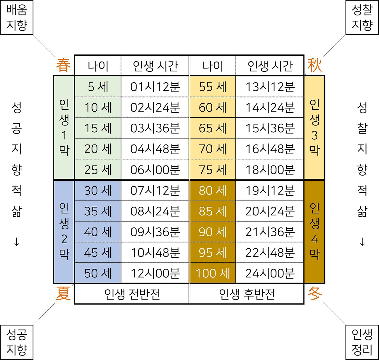 브런치 북 <그날이 오기 전에>는 인생 4막 중, 3막 전반부에 해당하는 50세부터 60세에 이르는 이야기다. 먼저 독자 여러분의 이해를 돕는 차원에서 인생 4막을 어떻게 구분했는지 알아볼 필요가 있다. 인생 1막은 만물이 소생하는 봄(春)에 해당한다. 이때는 배움에 집중하는 시기로 일반적으로 25세까지라고 보았다. 인생 2막은 26세부터 50세 해당하는 초록의 계절 여름(夏)이다. 이때는 성공하기 위해 동분 서주 하는 시기라고 할 수 있다. 인생 3막은 천고 마비의 계절, 가을(秋)이다. 이때는 자신을 돌아보는 자기 성찰이 필요한 시기로 51세부터 75세에 해당한다. 마지막 인생 4막은 동장군이 기승을 부리는 겨울(冬)로, 삶을 정리하며 죽음에 다가서는 75세 이후라고 보았다. 이를 100세 시대 관점에서 인생 전반과 후반으로 나누어보면 50세가 인생의 반환점임을 알 수 있다. 보편적으로 인생 전반은 성공을 향해 나아가는 성공지향적 삶을 지향하는 반면, 인생 후반은 자신의 한계를 인정하면서 자기를 돌아보는 성찰 지향적 삶으로 옮겨가기 시작한다.