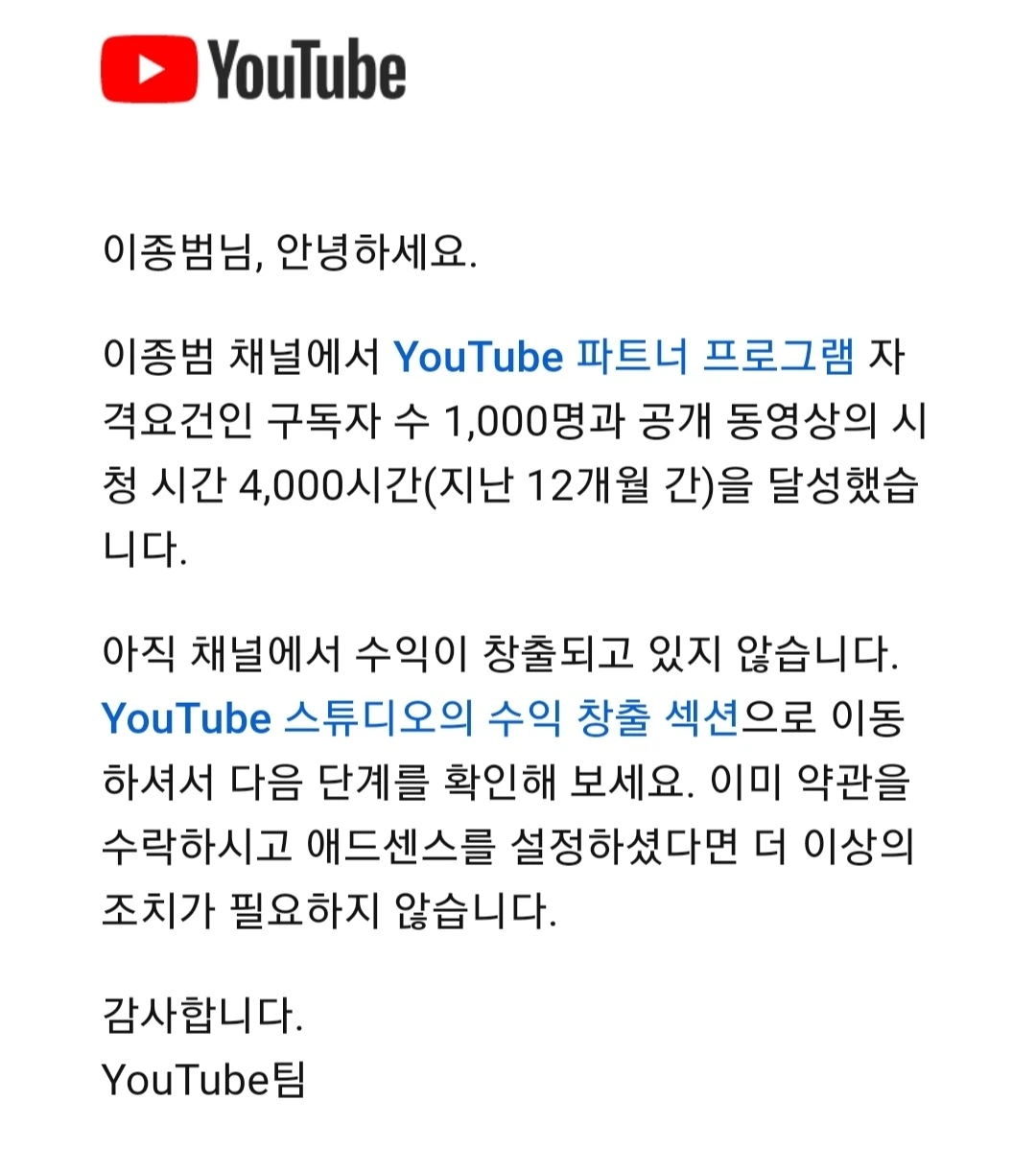 그렇지 않아도 구독자 1000명, 조회 시간 4000h이 넘으면 수익 창출이 가능하다는 메일을 받을 수 있게 신청을 했기 때문이다
