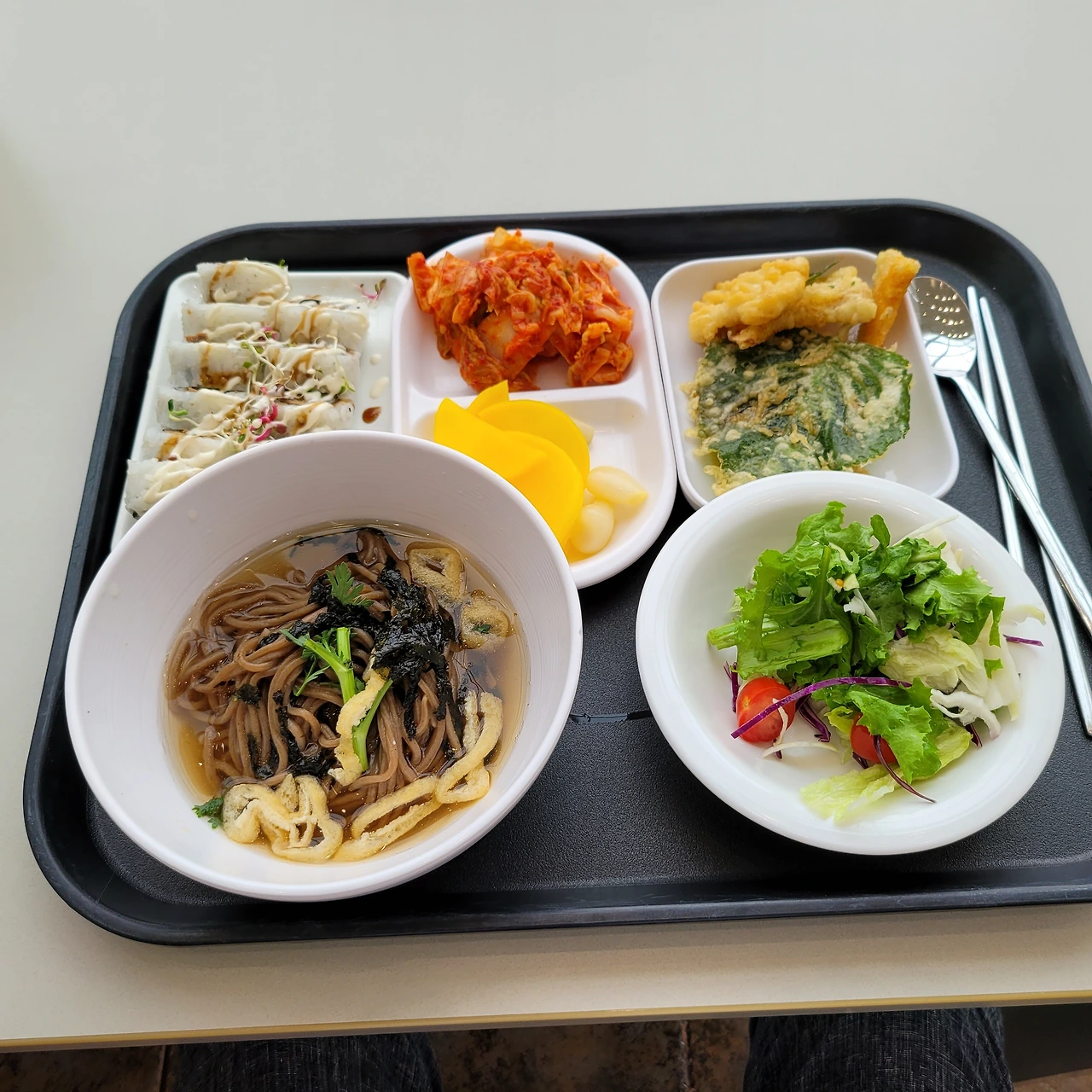 메밀 온면 국수와 누드김밥, 그리고 튀김으로 든든히 배를 채웠다.