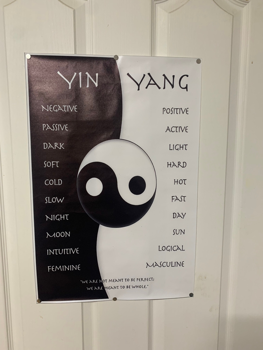 방 문에 붙여둔 태극 음양 포스터. 문양을 보면 음 안에 양이 있고 양 안에 음이 있지? 모든 건 따로 동떨어져있지 않아. 서로 공존하는 거야.