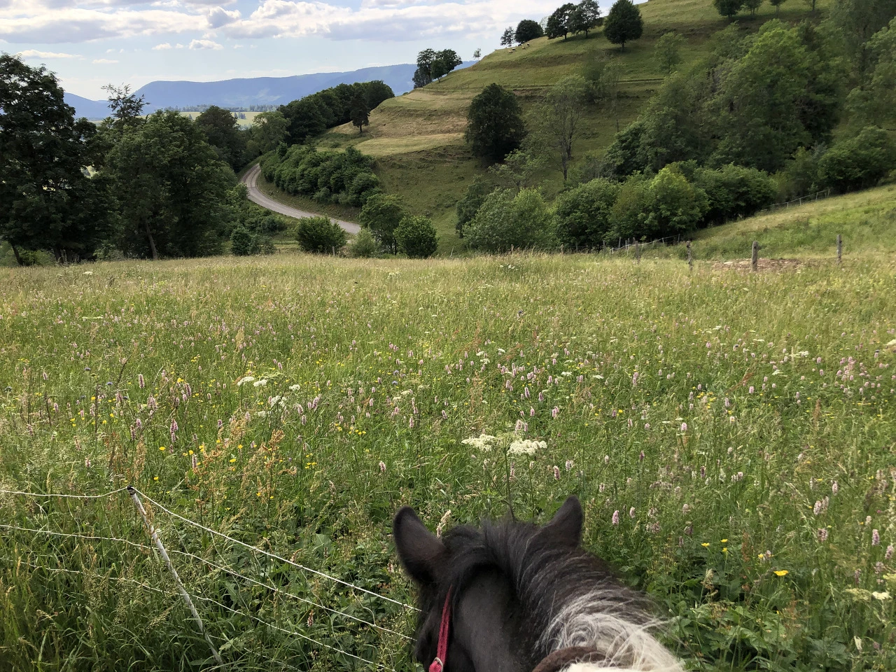 중간중간 구보도 여러번 하면서 우리는 꽤 먼 거리를 달렸다. 언제 여기를 다시 올 수 있을까 하는 마음에 나는 풍경 한장면 한장면을 눈에 꼭꼭 담아가려 애썼다. 그날은 날씨가 유독 좋았다. 비오고 흐린 날의 알자스도 아름다웠지만, 화창한 하늘을 배경으로 펼쳐지는 초원과 산세는 비현실적이게 느껴질 정도로 눈부셨다. 일주일동안 그렇게 말만 탔는데도 오늘이 마지막이라는 사실이 떠오를 때마다 지금 바케호와 내딛는 한걸음 한걸음이 아쉽기 그지 없었다.