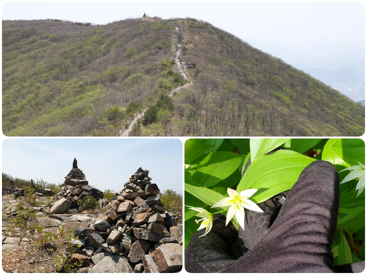 저간의 사정이 이렇다 보니 산객들의 무료함이 만들어 놓은 서봉의 케언(돌무더기)과 봄의 진달래, 철쭉, 하얀 별처럼 빛나는 "애기나리"꽃이 시선을 잡아끄는 큰 구경거리이다.보라색, 흰색, 노랑색이 어우러져 피어나는 제비꽃도 등산객의 발길을 잡기에는 충분하다.