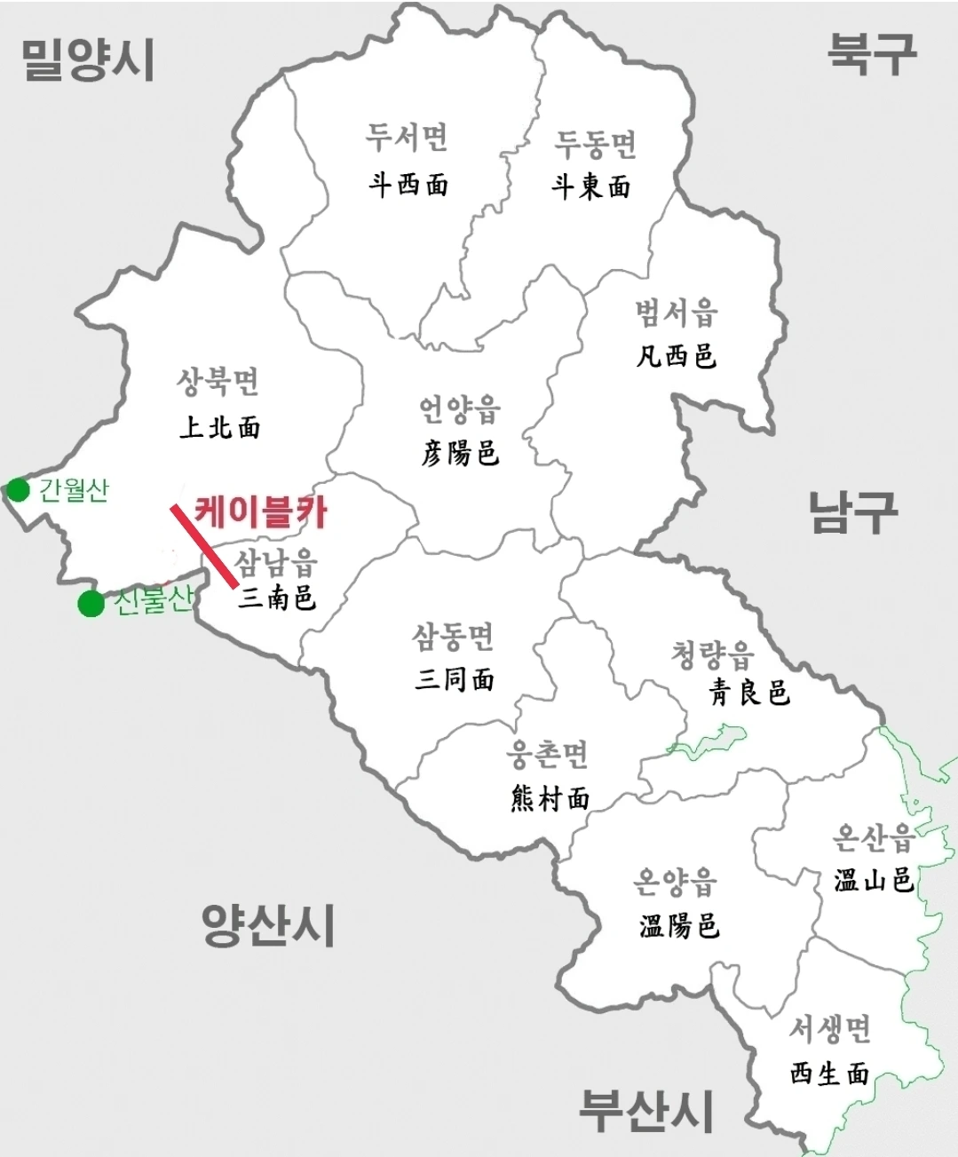 얄팍한 케이블카 장사치들이 울주군 상북면 주민들을 기만하고 있는 것 같아서 답답한 마음에 몇 자 적어 본다. 상북면의 행정구역은 산전리•지내리•향산리•천전리•등억알프스리•명촌리•길천리•거리•양등리•궁근정리•소호리•덕현리•이천리 등 법정리 13개리가 있다. 거기에 부락 단위로 조금 더 쪼개 행정리 기준으로는 22개 리가 있다.