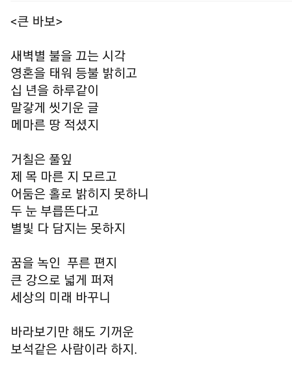 오늘 시인이 적은'푸른 편지'를 접하며, 장황한 사설을 통해 휴머니스트 군인작가를 그려 내고자 했던 필자가 부끄러워졌다. 액션 영화 <존윅 4>에서 주인공 키아누 리브스는 169분의 러닝 타임 동안, 단 103 줄 380 단어(시나리오 기준)만으로 연기를 완성시켰다고 한다. 시인의 작품 <큰 바보>는, 글이 길고 말이 많아야 칭송이 되는 것이 아니라는 점을 새삼 깨닫게 해 준다.
