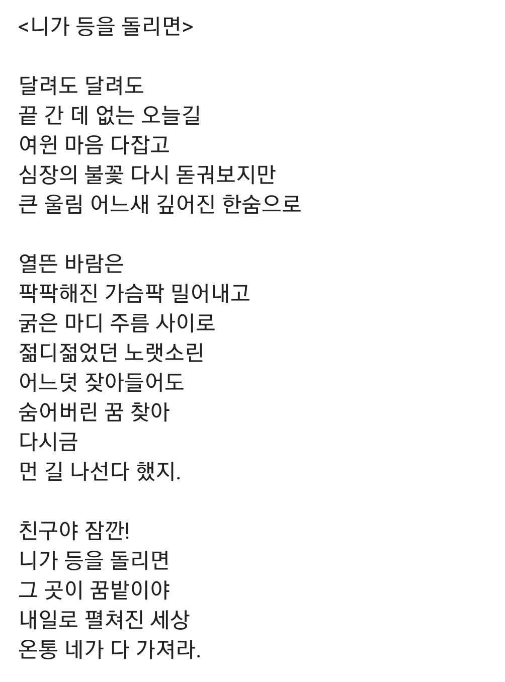 친구는 앞만 보고 내달리니 어디에 서 있는지 모를 것이나, 시인은 친구의 등 뒤에서 친구가 밝히며 나아가려는 길을 살펴보았을 것이다. 그리고 그 길이 내일로 펼쳐진 그 세상이 맞다고 이 시를 통해 응원하고 있다.